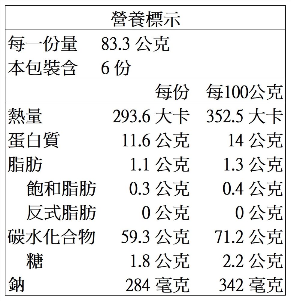 首頁 所有商品 麵類商品 日福麵 日福麵NT$139 商品資訊會因食品標示管理法規作調整故以實際包裝為準。 日福麵 數量 加入購物車 貨號: 4713958254932 分類: 所有商品, 素食商品, 麵類商品 標籤: 譽方媽媽 描述 額外資訊 品名:日福麵 成分:高筋麵粉、水、白木耳、黑木耳、蓮子、山藥、昆布、紅麴米、食鹽 淨重:500公克 原產地:台灣 保存期限:一年 有效日期:標示於包裝上 保存方法:請置於陰涼乾燥處,避免陽光直射,開封後請冷藏保存。 過敏原資訊:本產品含有小麥。 重量 500 公克 相關商品 元泰碩宴醬拌麵組合包素食商品, 麵類商品 NT$179 加入購物車 椴木椎茸菇禮盒禮盒商品, 素食商品, 南北貨商品 NT$2,198 加入購物車 關廟刀削麵素食商品, 麵類商品 NT$129 加入購物車 極品燕窩銀杏玉露禮盒(6罐入)所有商品, 禮盒商品, 養生飲系列, 素食商品 NT$1,188 加入購物車